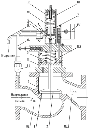 Клапан сбросной состоит из исполнительного клапана I с поршневым приводом II и управляющего клапана III. Для передачи информации о срабатывании сбросного клапана и степени его открытия на пульт управления, клапан снабжён сигнализатором положения IV. Клапан сбросной работает по принципу регулятора давления «до себя». Направление потока рабочей среды через клапан показано стрелкой. Положение клапанной тарели 2 относительно седла 1 исполнительного клапана определяется положением золотника 5, связанного с чувствительным элементом управляющего клапана III – сильфоном 7, который нагружен с одной стороны входным давлением Pвх, поступающим по трубке 4 через штуцер «а», а с другой – настроечной пружиной 9. Вращением винта 10 устанавливается требуемое значение давления срабатывания сбросного клапана Pвх. При закрытом управляющем клапане III давление управления Pупр в полости П3 равно входному давлению рабочей среды Рвх (за счёт поступления рабочей среды по импульсной трубке 4 через штуцер «в») и исполнительный клапан I закрыт. Повышение входного давления Pвх до настроенного значения приводит к смещению сильфона 7 и золотника 5 в сторону его открытия. При этом давление Pупр в полости П3 снижается за счёт сброса рабочей среды из полости П3 по импульсной трубке 8 в дренаж и поршневой привод перемещает клапанную тарель 2 в сторону открытия. В результате происходит сброс рабочей среды со входа исполнительного клапана I в дренаж и рост давления Pвх прекращается. При падении давления Pвх сильфон 7 перемещает золотник 5 управляющего клапана III на закрытие. Давление Pупр возрастает и поршневой привод исполнительного клапана I перемещает клапанную тарель 2 на закрытие. Таким образом, осуществляется стабилизация давления на входе сбросного клапана.